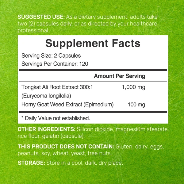 • Dosage & Servings – 240 high concentrated capsules per bottle, 2 capsule serving size, provides 1,000mg tongkat ali root (longjack) from a 300:1 extract with 100mg horny goat weed extract per serving, lasts up to a 120-day supply.