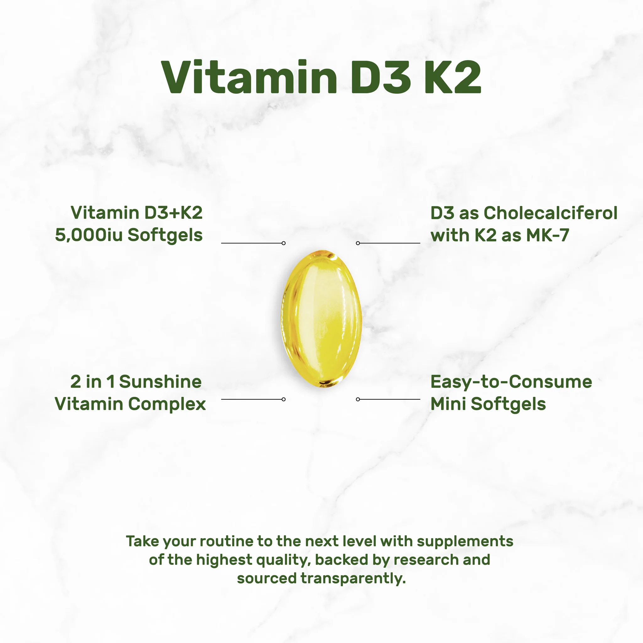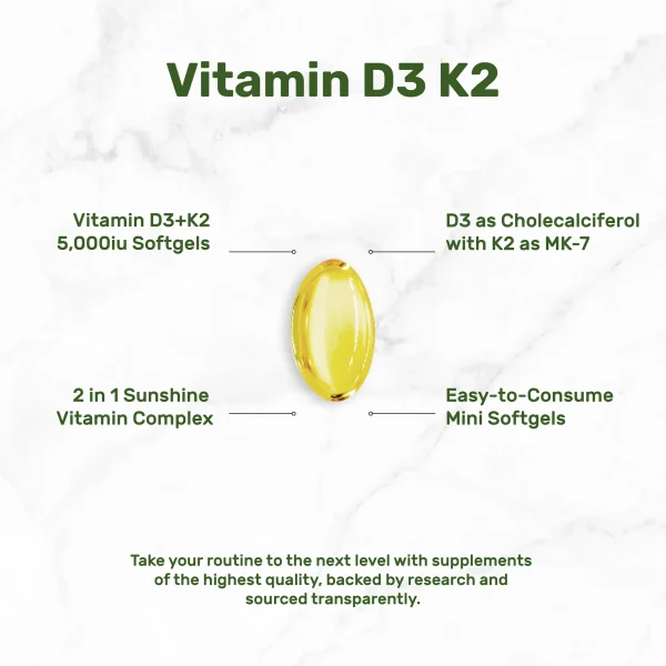 • 2 in 1 Support – Liquid vitamin D3 with K2 supplement, provides 5,000iu vitamin D3 plus vitamin K2 100mcg (MK7) in a once daily easy-to-swallow mini softgel.